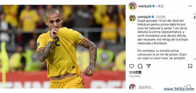 米特里策在社媒写道:“在首次穿上国家队运动活动 服 近14年、完成一线队首秀逾7年之后,我迎来了一个艰难却必要的决定:从罗马尼亚国家队退役。