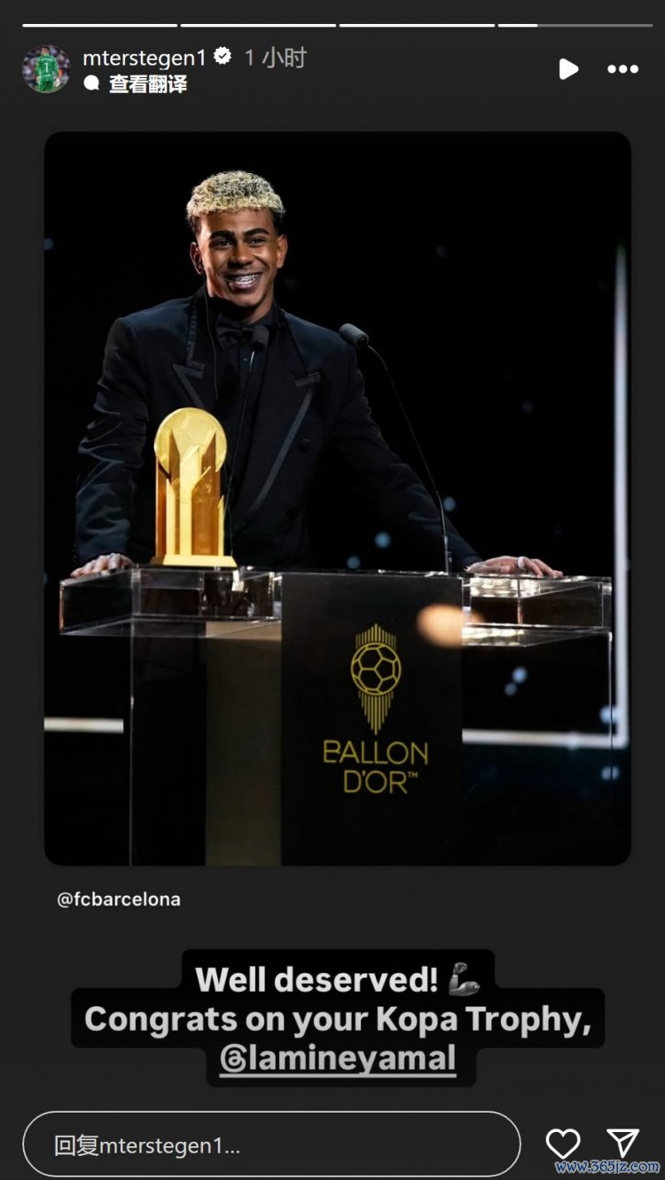 特尔施特根还晒出亚马尔领奖的照片:“实至名归, 伯恩茅斯祝贺你获得科帕奖。”