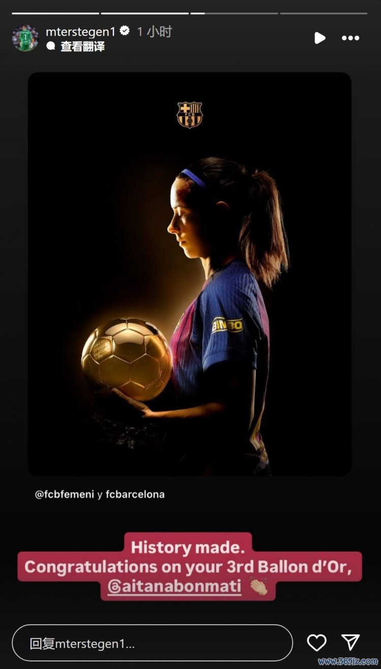 特尔施特根社媒晒出邦马蒂获奖的海报:“书写历史, 田径新闻直播吧祝贺你第3次获得金球奖。”