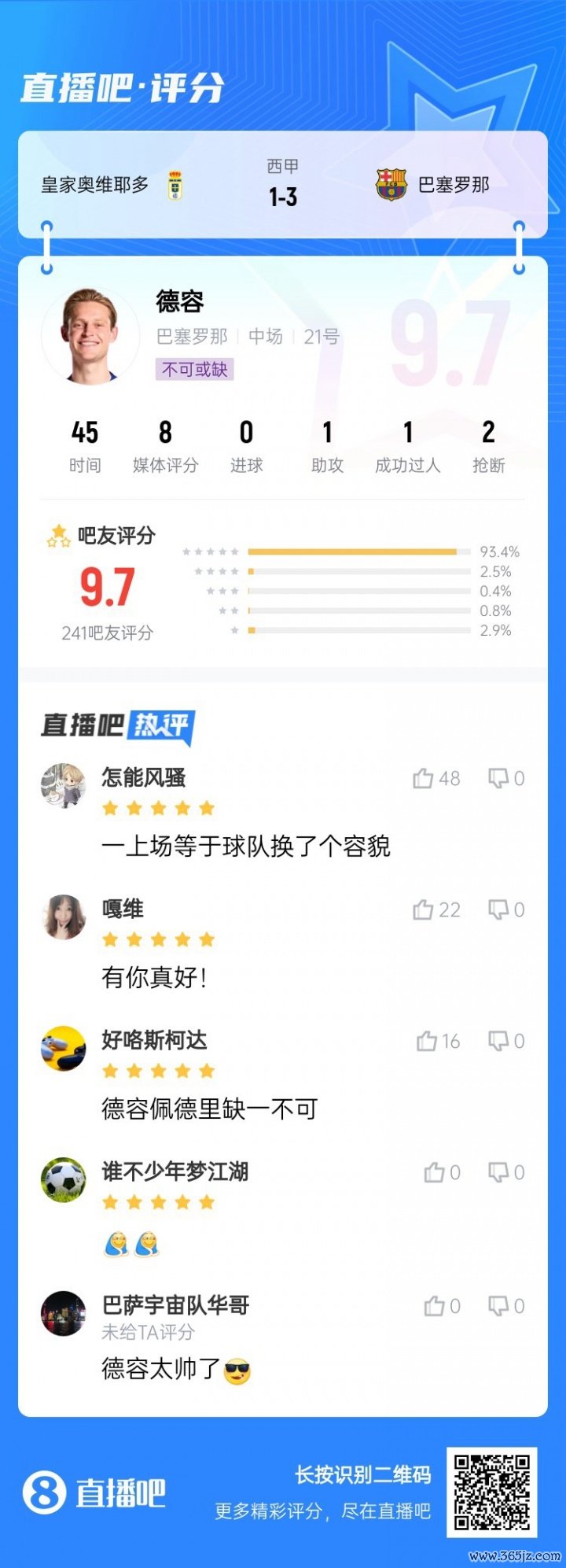 德容本场后备 出战半场,收获1次助功 。吧友评分高达9.7分。