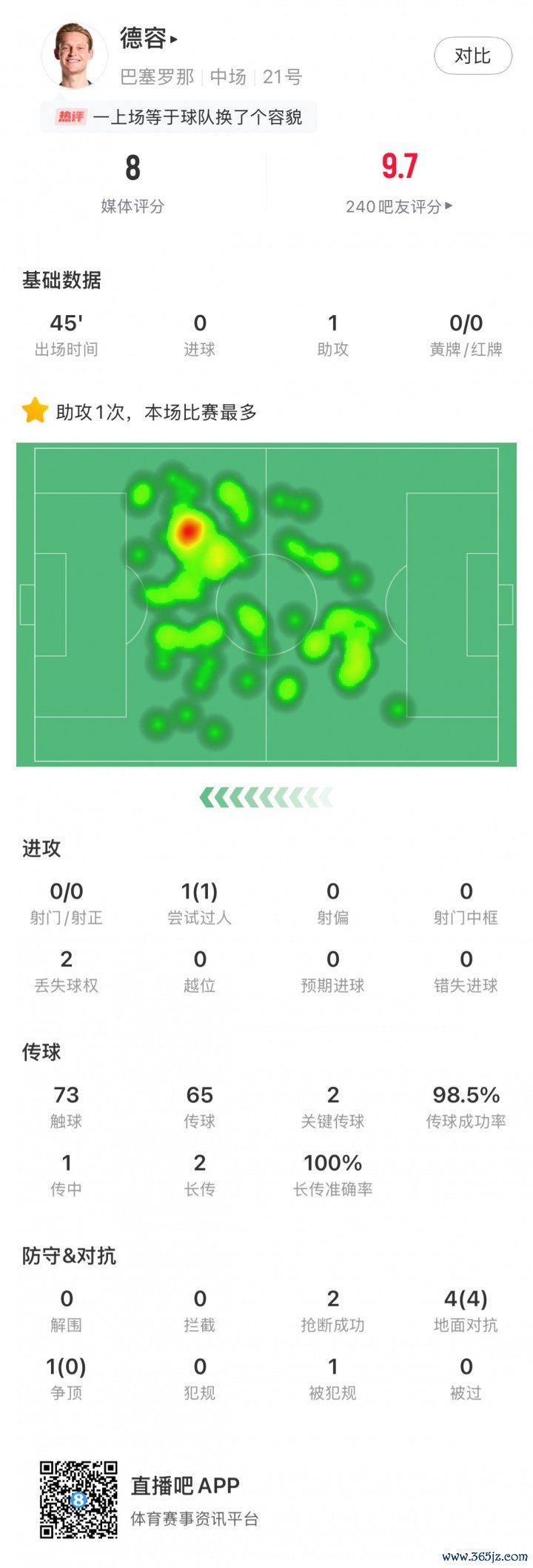 德容半场时间73次触球, 田径新闻65次传送球 , 伯恩茅斯NBA直播2次关键传送球 ,田径新闻4次地面对峙 全部成功,2次抄截 成功。