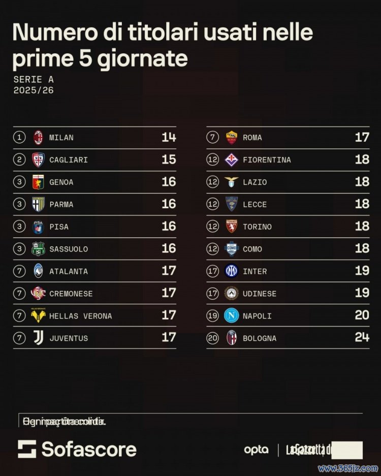 10月5日讯 据《米兰体育报》报道称,米兰本赛季意甲目前只用了14名杆位球员 员,位列全职业联赛 最少。