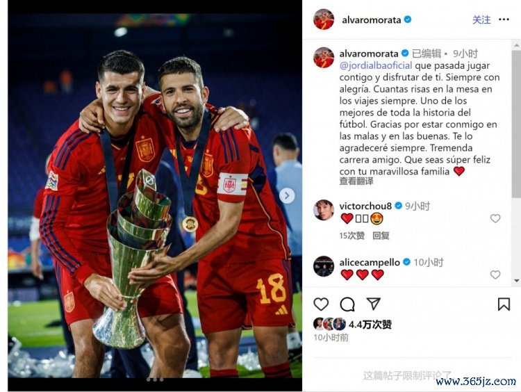 10月8日讯 阿尔巴宣布将在本赛季结束后退役,曾在西班牙队与他共事的莫拉塔社媒发文致敬。