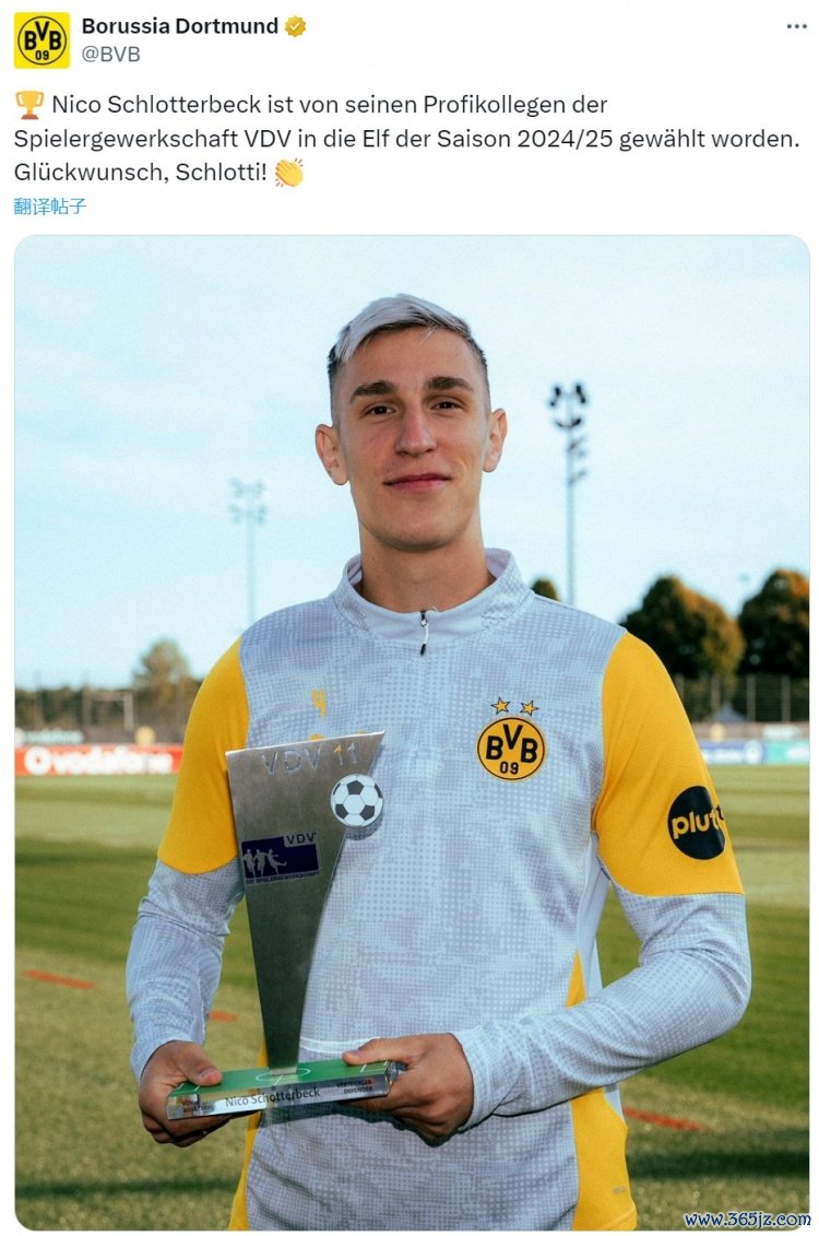 施洛特贝克入选德国职业球员工会(VDV)上赛季最佳阵容178直播足球直播, 伯恩茅斯英超直播多特官方社媒晒出他手捧奖杯的照片,田径新闻对他表示祝贺。