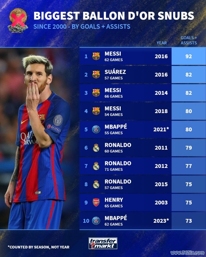 德国转会市场盘点了各年份金球奖数据,排出了对应年份中无缘金球奖的最高进球+助攻数据。