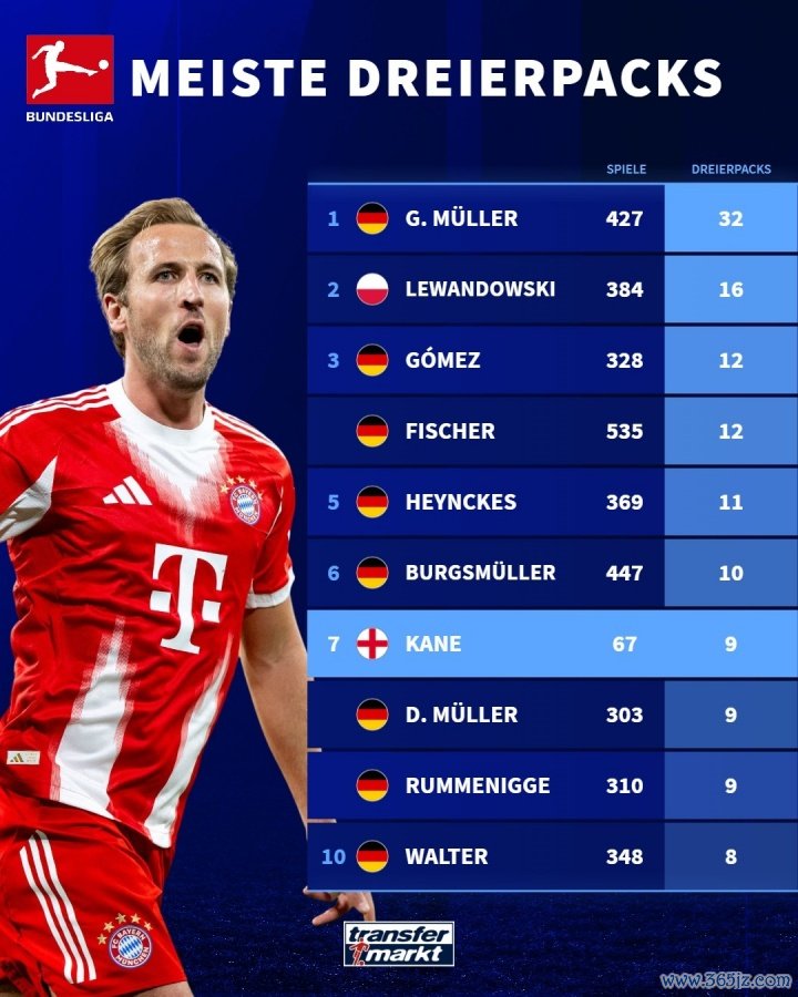 德转统计了德甲历史帽子戏法榜,盖德穆勒32次帽子戏法断层领先,凯恩仅用67场就排在历史第7。
