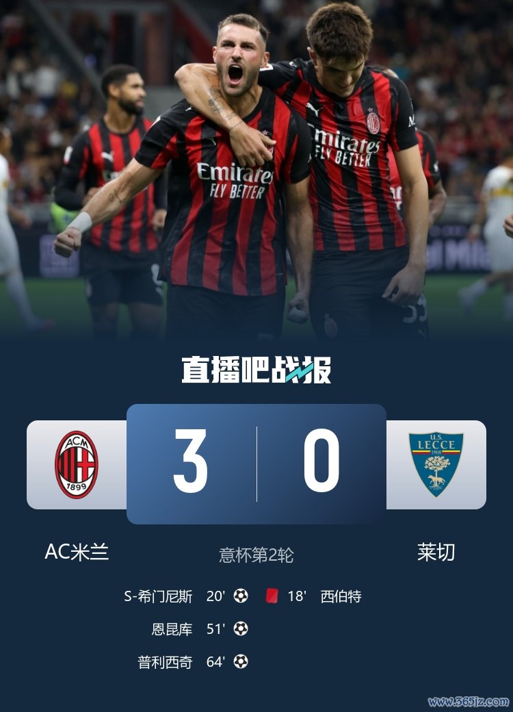 希门尼斯赛季首球,恩昆库处子球,普利西奇连场破门。最终AC米兰主场3-0完胜十人莱切晋级意杯16强。