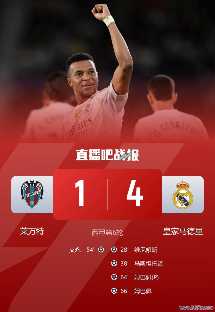 姆巴佩双响,马斯坦托诺首球,皇马4-1莱万特,六轮全胜18分领跑。