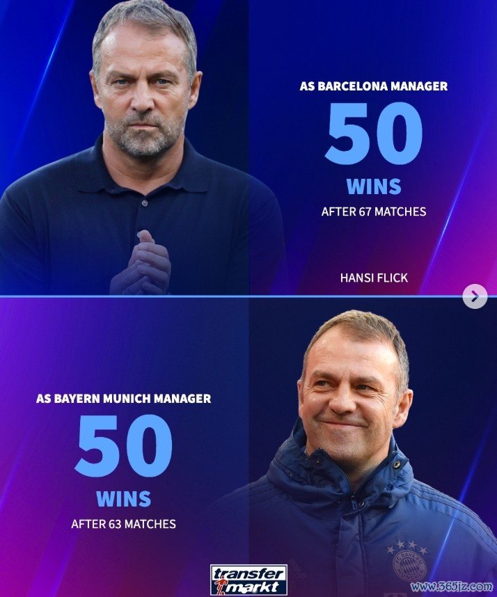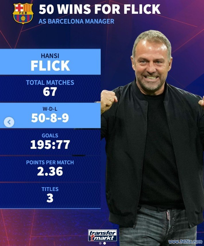 9月26日讯 巴萨本轮3-1击败奥维耶多,根据德转统计,弗里克实现巴萨50胜里程碑。