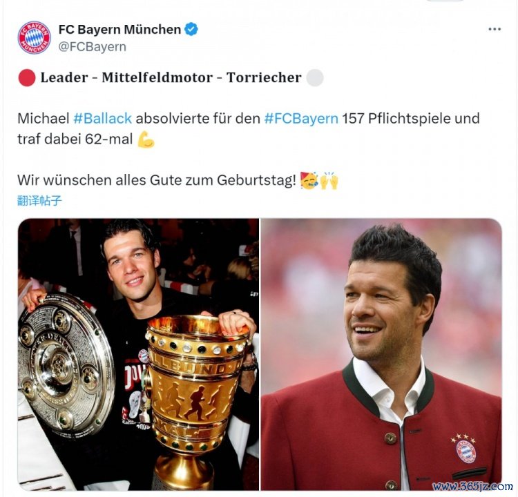 拜仁官方社媒晒出巴拉克效力球队时期的照片,配文:“领袖-中场发动机-进球机器。巴拉克为拜仁出战157场正式比赛,田径新闻直播吧打进62球, 田径新闻祝你生日快乐!”