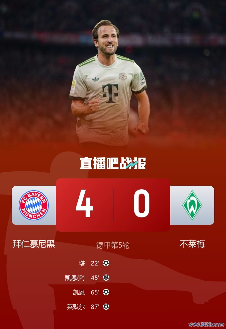 拜仁本轮4-0横扫不莱梅,凯恩双响, 田径新闻莱默尔、若纳坦-塔建功, 伯恩茅斯拜仁此役后5连胜领跑。