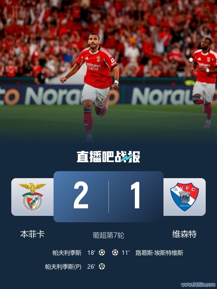 本菲卡本轮2-1逆转击败韦森特,帕夫利季斯本场斩获两球。