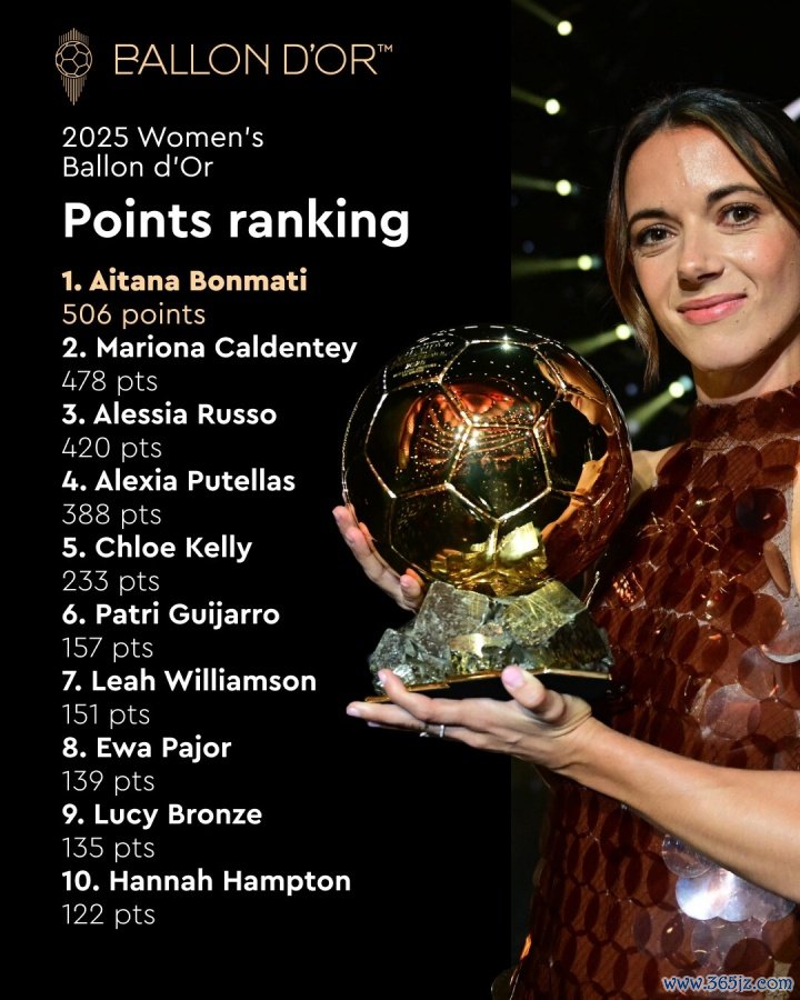 《法国足球》公布金球奖各排名得分情况,女足方面,邦马蒂以506分夺得金球奖,领先第二的卡尔登泰28分。