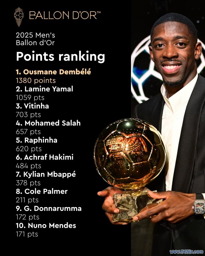 金球奖分数公布:登贝莱1380分第一!亚马尔1059分 拉菲尼亚620分