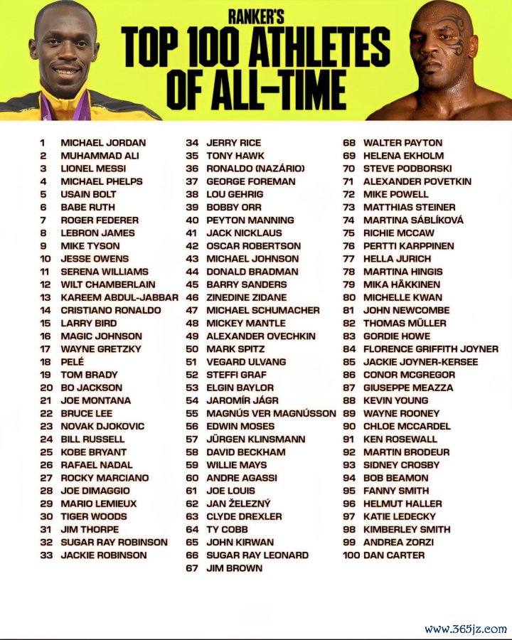 11月02日讯 外媒Global Statistics排历史百大运动员,梅西第3,仅次于乔丹和拳王阿里。足坛9人上榜,仅梅西进入前10,C罗第14、贝利第18、大罗第36、齐达内第46。