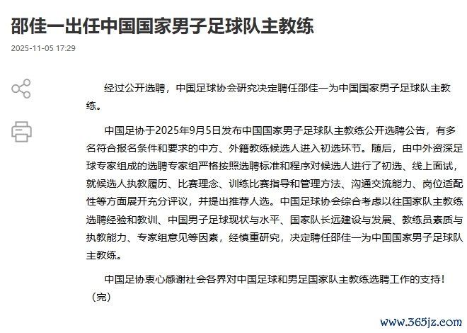 中国足协于2025年9月5日发布中国国家男子足球队主教练公开选聘公告,田径新闻有多名符合报名条件和要求的中方、外籍教练候选人进入初选环节。随后, 田径新闻英超直播由中外资深足球专家组成的选聘专家组严格按照选聘标准和程序对候选人进行了初选、线上面试, 伯恩茅斯就候选人执教履历、比赛理念、训练比赛指导和管理方法、沟通交流能力、岗位适配性等方面展开充分评议,并提出推荐人选。中国足球协会综合考虑以往国家队主教练选聘经验和教训、中国男子足球现状与水平、国家队长远建设与发展、教练员素质与执教能力、专家组意见等因素,经慎重研究,决定聘任邵佳一为中国国家男子足球队主教练。