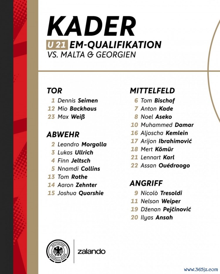 11月7日讯 德国U21公布新一期球员名单,卡尔、比朔夫、小伊布在列,田径新闻直播吧德国U21将在U21欧洲杯预选赛中对阵马耳他U21、格鲁吉亚U21。