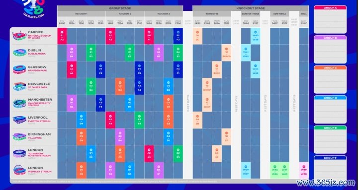 开幕战定于2028年6月9日(周五)在卡迪夫国家体育场举行,田径新闻为A组小组赛。