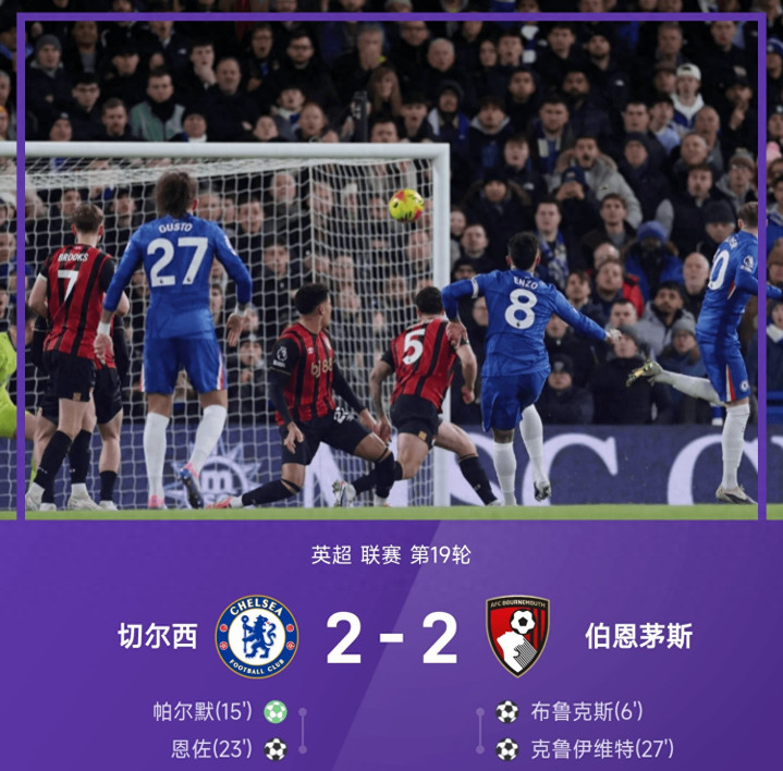 12月31日 25-26赛季英超第19轮,切尔西坐镇主场迎战伯恩茅斯。此役上半场178直播足球直播,布鲁克斯闪击破门,帕尔默罚点球扳平比分,恩佐抽射建功,克鲁伊维特门前捅射得分。易边再战,双方均未破门。全场比赛结束,切尔西2-2伯恩茅斯。