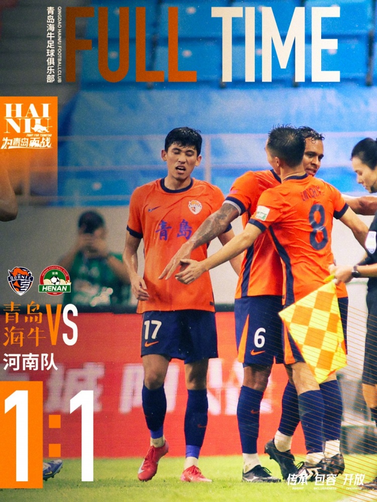 全场赛事 结束,青岛海牛1-1战平河南队,田径新闻体育直播林创益为球队打入一球。