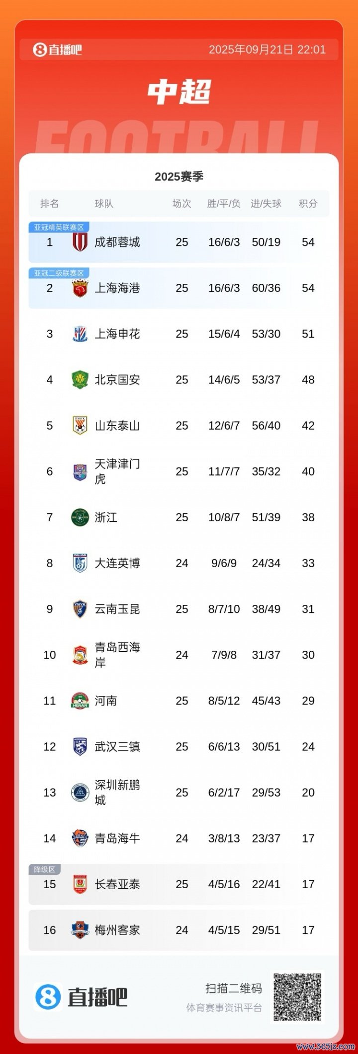 夺回榜首!中超积分榜:蓉城海港54分同分领跑,申花51分国安48分