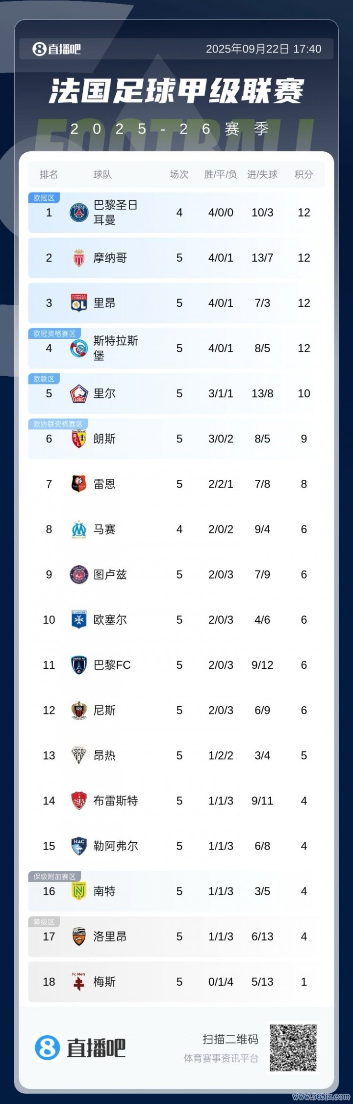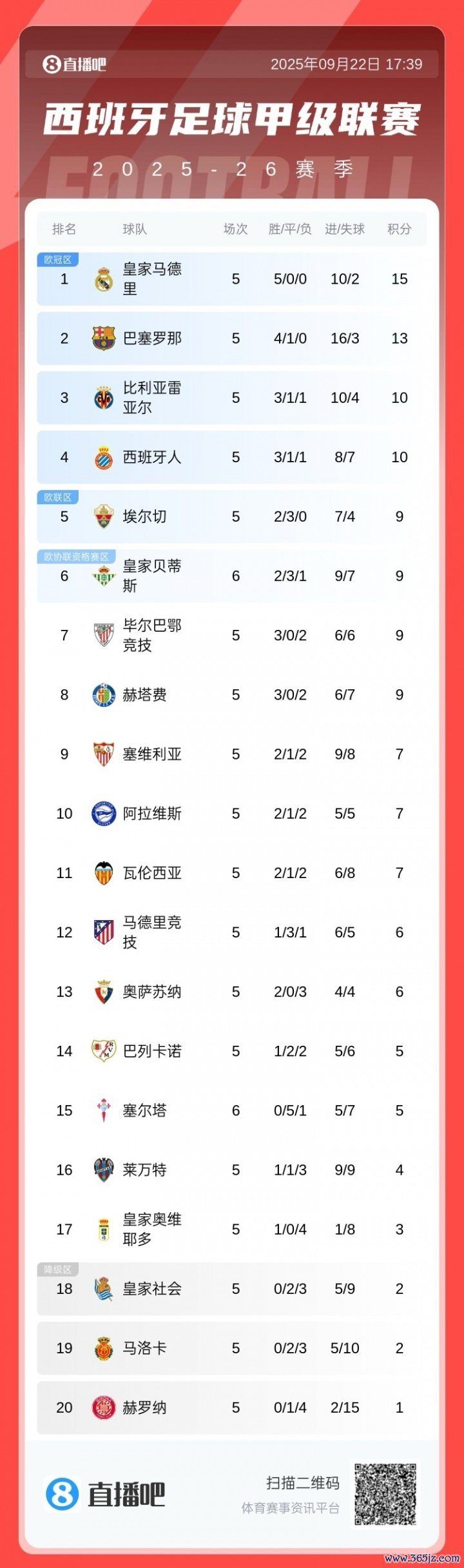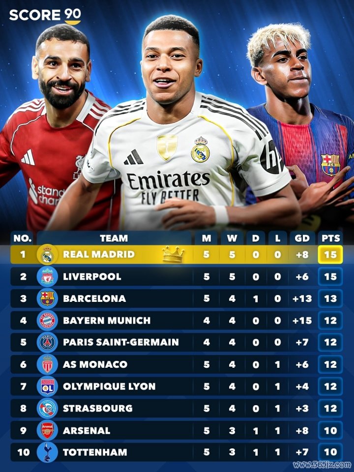 👀你的主队在哪?五大职业联赛 合体积分榜:皇马 利物浦5轮全胜领跑