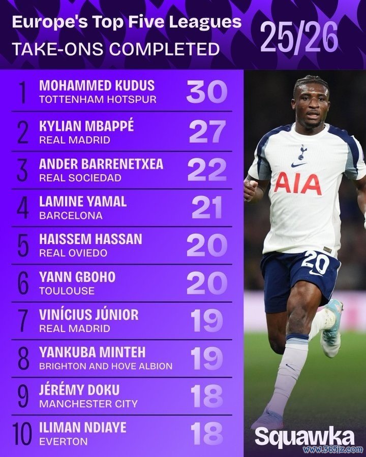10月17日讯 根据本赛季欧洲五大职业联赛 的数据统计 ,热刺球员库杜斯以30次成功过人领跑该项数据榜,田径新闻英超直播皇马前场球员姆巴佩以27次紧随其后。