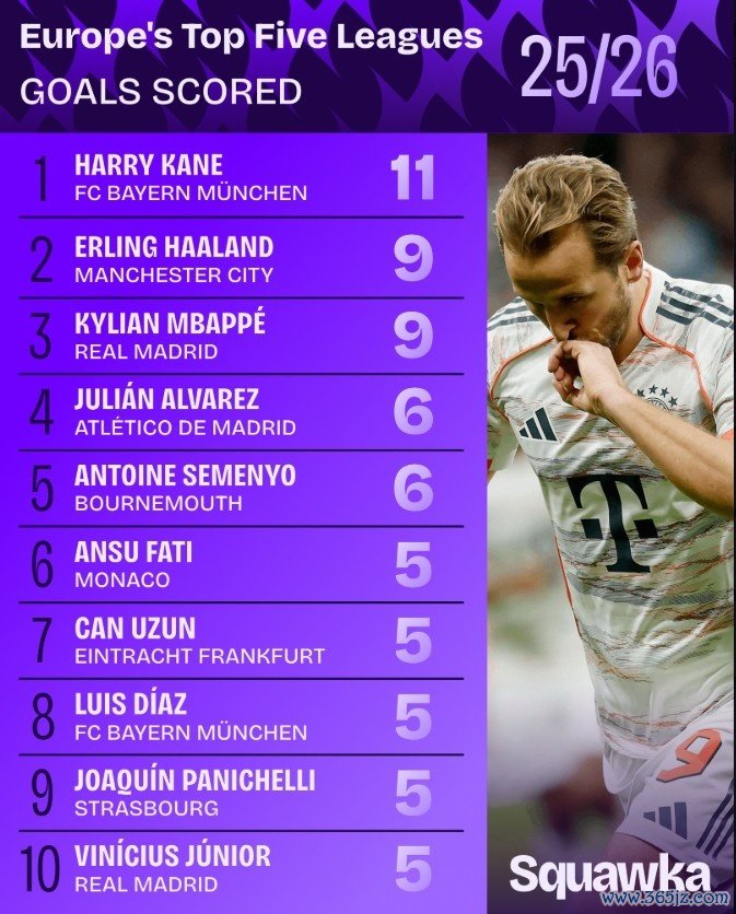 10月17日讯 本周末,欧洲五大职业联赛 将重燃战火。Squawka盘点了本赛季迄今为止五大职业联赛 得分 数情况,田径新闻足球直播凯恩以11球居首, 田径新闻哈兰德和姆巴佩均打进9球紧随其后。