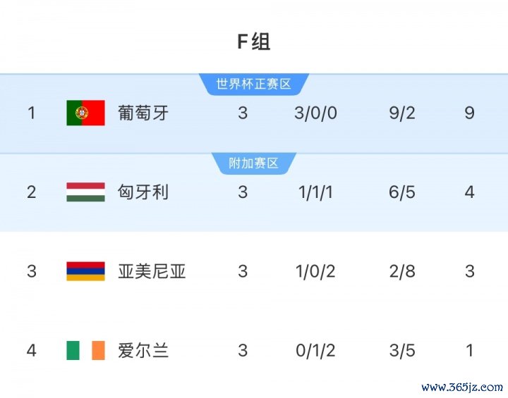 赛后,积分榜情况,田径新闻葡萄牙3连胜积9分, 田径新闻英超直播排名第一;匈牙利4分第二、亚美尼亚3分第三、爱尔兰只有1分排名垫底。