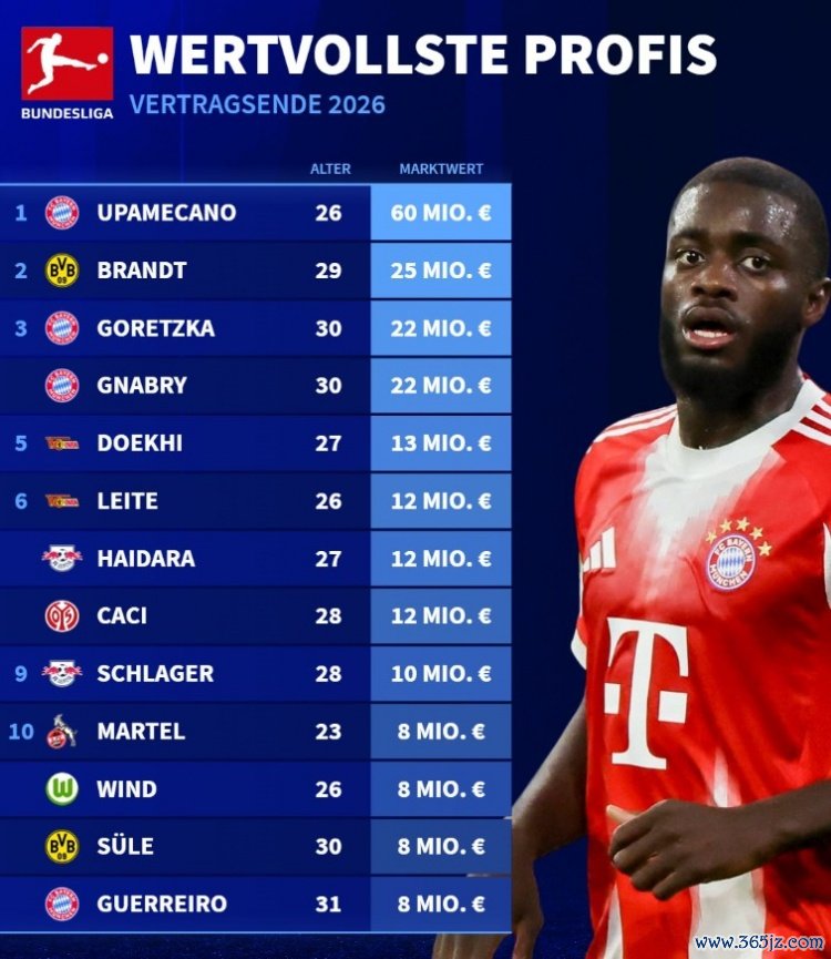 10月23日讯 《转会市场》统计了合同将在明夏到期的德甲球员身价情况,英超直播拜仁中卫于帕梅卡诺独自领跑。