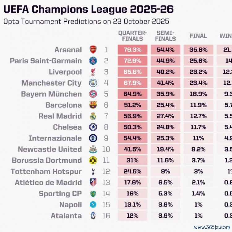 10月23日讯 欧冠职业联赛 阶段第三轮赛事 战罢,Opta超级计算机更新了各队的夺魁 概率,田径新闻英超直播阿森纳21.13%最高, 田径新闻巴黎、利物浦二三位。