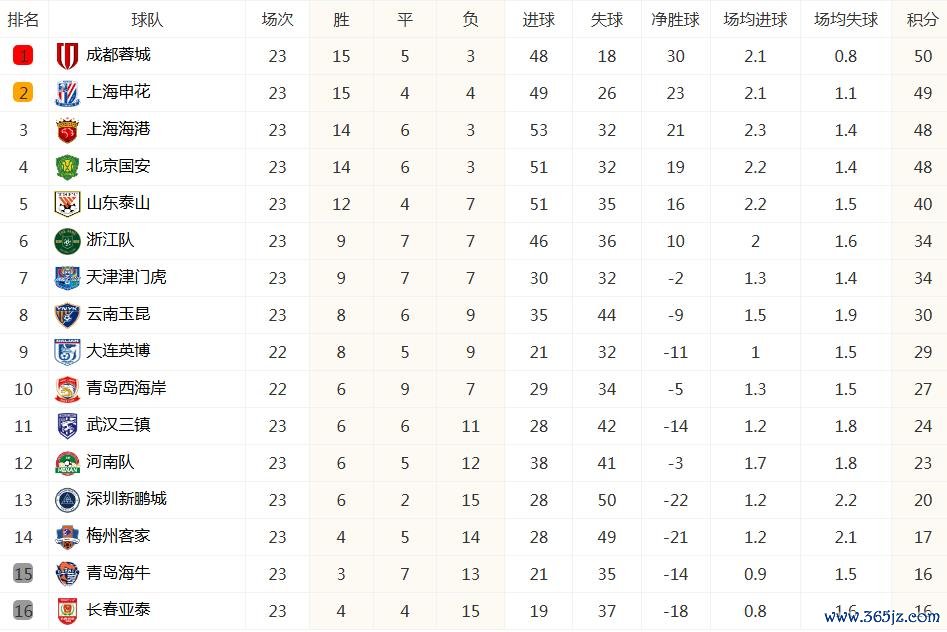 第23轮:蓉城主场作战 4-1海港,申花客场应战 0-1三镇,国安客场应战 0-6泰山;由于这一轮有争冠队之间的直接对话,且分出胜负,同时申花意外爆冷输球,加之鲁京大战国安大败 未积分 ,23轮战罢,蓉城以50分排名第1,申花49分排名第2,海港、国安同积48分排名第3、第4,而第1名的蓉城比第4名的国安多2分,分差没变。