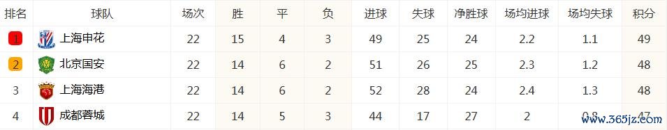 第22轮:申花客场应战 2-0海牛,体育直播国安主场作战 4-0三镇,海港主场作战 1-1津门虎,蓉城客场应战 5-1玉昆,由于海港在主场作战 被津门虎逼平,导致4队名次出现变化,申花以49分排名第1,国安、海港同积48分排名第2、第3,蓉城47分排名第4,第1名的申花比第4名的蓉城多2分,分差有所缩小。