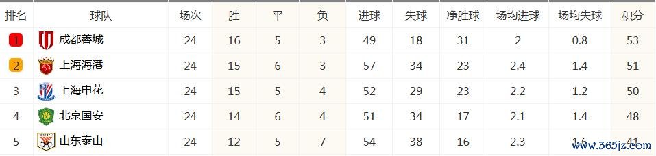 目前,4支争冠队的积分排名是:蓉城53分仍居榜首,海港51分排名升至第2,申花50分排名滑至第3,国安48分不变,排名跌至第4;其中第1名的蓉城比第2名的海港多2分,比第3名的申花多3分,比第4名的国安多5分。