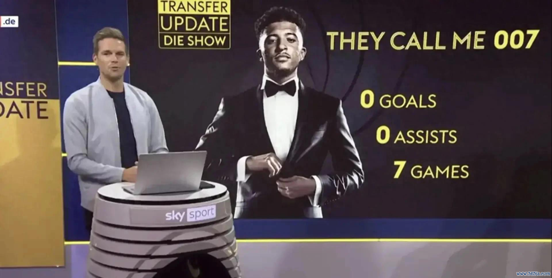 这是德国天空体育节目《转会更新》(Transfer Update. Die Show)的截图。有趣的是,这并非主持人的原创——他们只是将社交媒体上关于桑乔在曼联起步挣扎的梗推向了新高度。