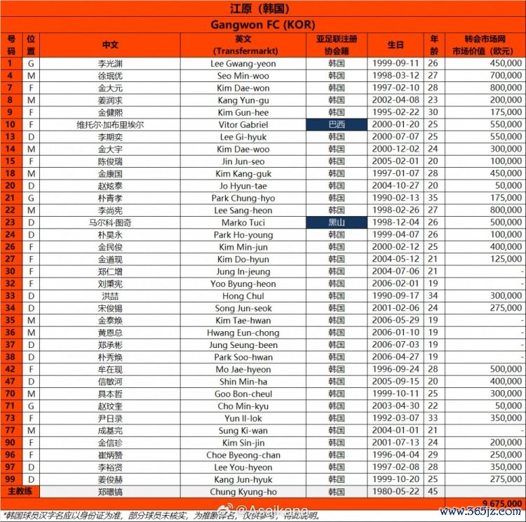 2025-26赛季亚冠精英职业联赛 (职业联赛 阶段)韩国江原FC球员名单