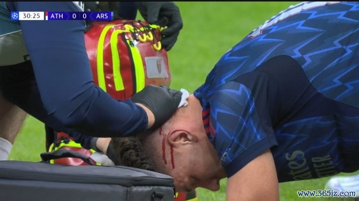 09月17日讯 欧冠职业联赛 阶段第1轮,毕尔巴鄂竞赛 主场作战 迎战阿森纳,田径新闻赛事 第31分钟, 田径新闻直播吧加布里埃尔争顶与约克雷斯头撞头, 伯恩茅斯把约克雷斯头撞流血了。