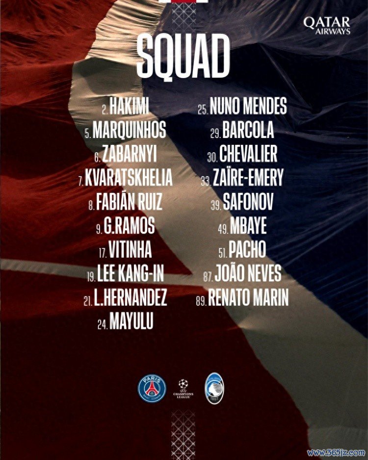 巴黎欧冠大名单:2-阿什拉夫、5-马尔基尼奥斯、6-扎巴尔尼、7-克瓦拉茨赫利亚、8-法比安-鲁伊斯、9-贡萨洛-拉莫斯、17-维蒂尼亚、18-李刚仁、21-卢卡斯-埃尔南德斯、24-马尤卢、25-努诺-门德斯、29-巴尔科拉、30-舍瓦利耶、33-小埃梅里、39-萨福诺夫、49-姆巴耶、51-帕乔、87-若昂-内维斯、89-马林球探比分